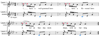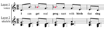 Example 15. Tune-Yards, “Wooly Wolly Gong” (2011), chorus (click to enlarge and listen) | Example 16. Tune-Yards, “Wooly Wolly Gong” (2011), ukulele introduction (click to enlarge and listen) |
