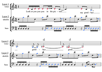 Example 19a. Tune-Yards, “For You” (2009), transcription of ukulele introduction (third phrase) (click to enlarge) | Example 19b. Tune-Yards, “For You” (2009), reduction of introduction (third phrase) (click to enlarge and listen) |