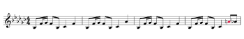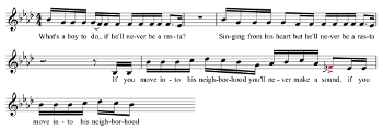Example 14a. Tune-Yards, “Riotriot” (2011), verse 1, third phrase (click to enlarge and listen) | Example 14b. Tune-Yards, “Riotriot” (2011), verse 1, fourth phrase (click to enlarge and listen) |