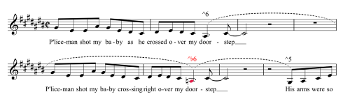 Example 7. Tune-Yards, “News” (2009), verse 2, third phrase (syllables with naturally occurring phonetic accents are in bold text)