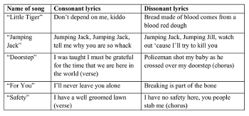 Example 23. Summary of lyrical consonance and dissonance in five Tune-Yards songs
