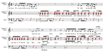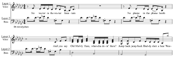 [1.6] As is the case with “Jumping Jack,” a dissonance that initially seems incidental (in both songs, the dissonant note is the chromatically lowered submediant) takes on greater significance when it is embedded into the core fabric of the song, recurring over and over again in a repeating loop.(4) There is a consistent division of pitch resources between the two layers: in Example 2, Layer 2 contains only the unaltered form of