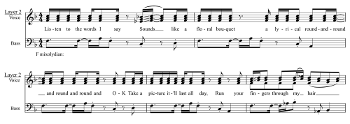 [3.7] As is the case with “Little Tiger,” the chromatic inflections of the vocal melody of “Sunlight” become more pervasive as the verse progresses. As illustrated in Example 10, “Sunlight” begins more like a Caught in the Looper example, with a clash between the supertonic scale degrees of the seemingly static melody and accompaniment layers. Neither the D nor the