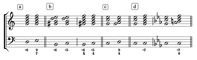 Example 16. Chords “by supposition”: (a) of the nine-seven, (b) of the superfluous fifth with and without its “borrowed” 4th, (c) of the nine-four, and (d) of the superfluous seventh with and without its “borrowed” 6th