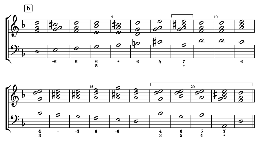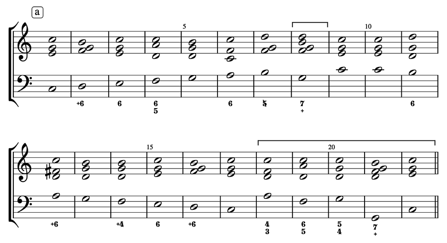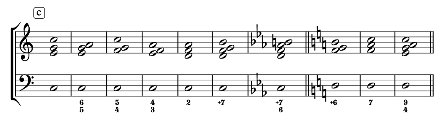 Example 3. (a–b) Règle de l’octave (Rameau 1722) in major and minor keys; (c) Other chord possibilities