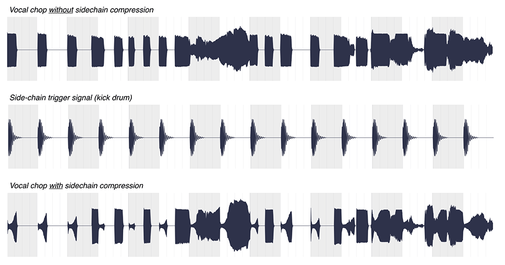Example 5. Waveform representations of the chopped-up vocal appearing in the hook after the refrain (for example, between 0:57 and 1:35) in “I Took a Pill in Ibiza,” depicting the signal’s envelope as it appears without sidechain compression (above) and with sidechain compression (below) that is triggered by the signal depicted in the middle