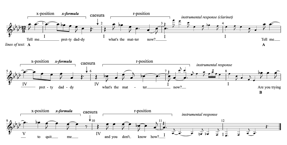 Example 1. Ida Cox, “Ida Cox’s Lawdy, Lawdy Blues” (1923); standard twelve-bar blues with AAB poetic form, x- and r-positions separated by caesuras, and instrumental responses following each line