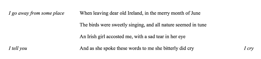 Example 11. Lyric formulas in the first verse of “Three Leaves of Shamrock,” by James McGuire (1889) and “Leaving Dear Old Ireland,” by Charlie Poole with the North Carolina Ramblers (1929)