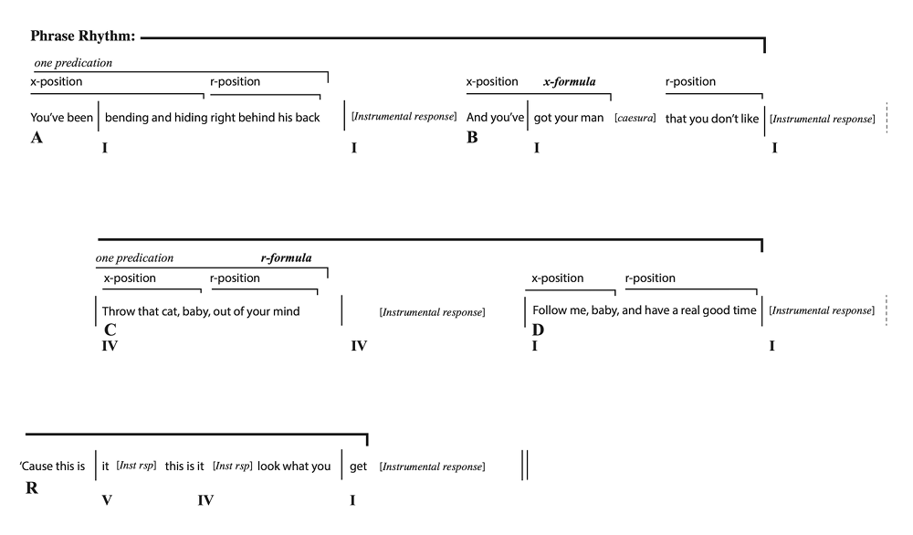 Example 22. AB/CD/R poetic form and longer vocal phrases in Willie Dixon’s “300 Pounds of Joy,” verse 2; with x- and r-positions confined to half a bar, some pairs combining with only one predication; multiple call and response pairings in each phrase; and acceleration of harmonic rhythm in last phrase, resulting in abbreviation of the form to ten bars (https://www.youtube.com/watch?v=fJ2UadHc_Qg; accessed September 4, 2020))