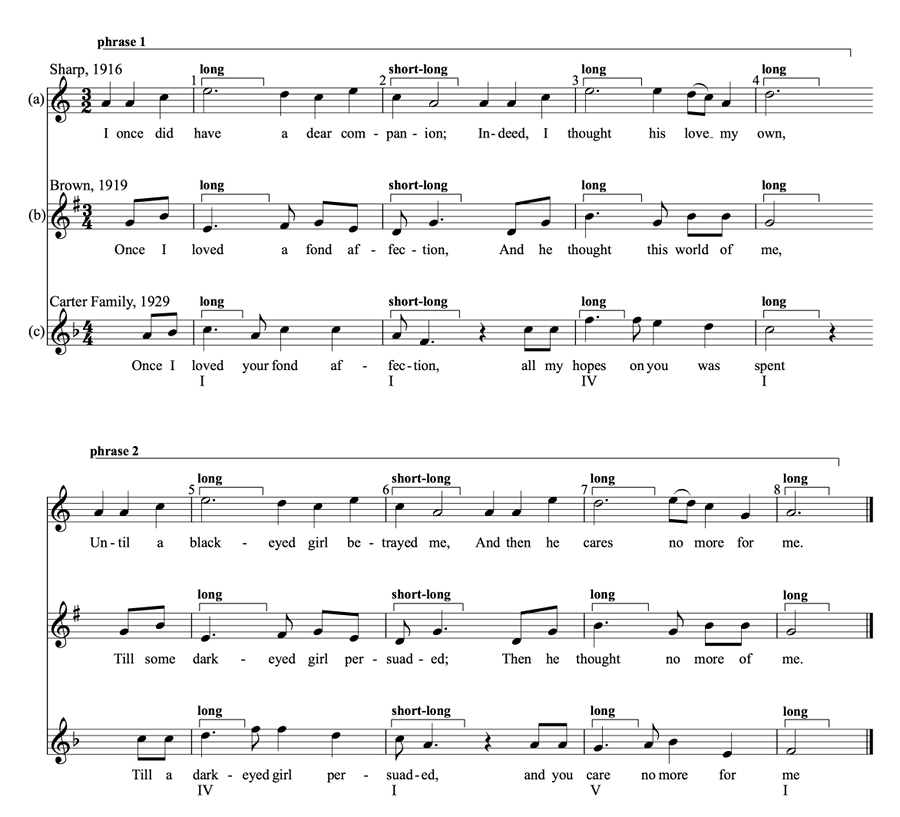 Example 7. Musical comparison of “Fond Affection” as collected by (a) Sharp (1932, 2:109); (b) Brown (1952, 2:401–2); and (c) recorded by the Carter Family