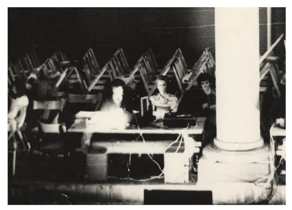 Example 3. Lediņš’s disco at the Polytechnic Student Club. Lediņš is seated on the left behind the desk with audio-playback equipment. Photographer unknown. Collection of the Latvian Centre for Contemporary Art