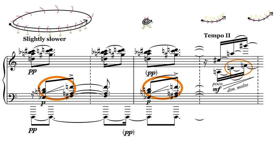 Example 10. Trace-form and score excerpt of mm. 17–20, 0’57”–1’11”Heavy, slow, gathering/circular gestures are marked with thick orange circlesLight, quick, scattering gesture marked with thin orange circle