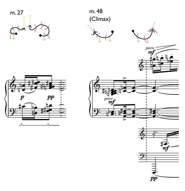 Example 12. Gathering gesture of motif i in m. 27, 1’29” vs. anti-gathering gesture of motif ii in m. 48, 2’40”