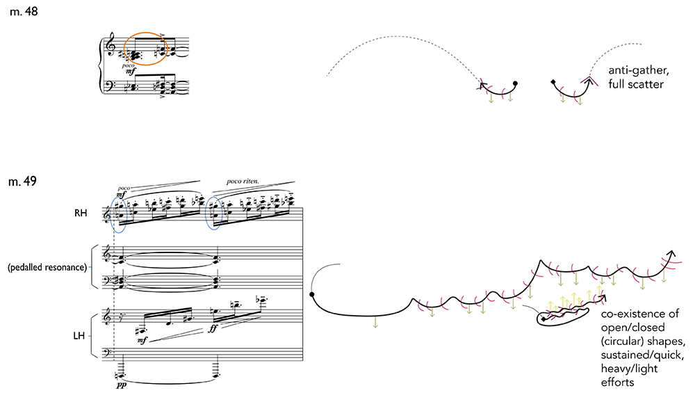Trace-forms and score excerpt of mm. 48–9, 2’40”–2’50” (climax)