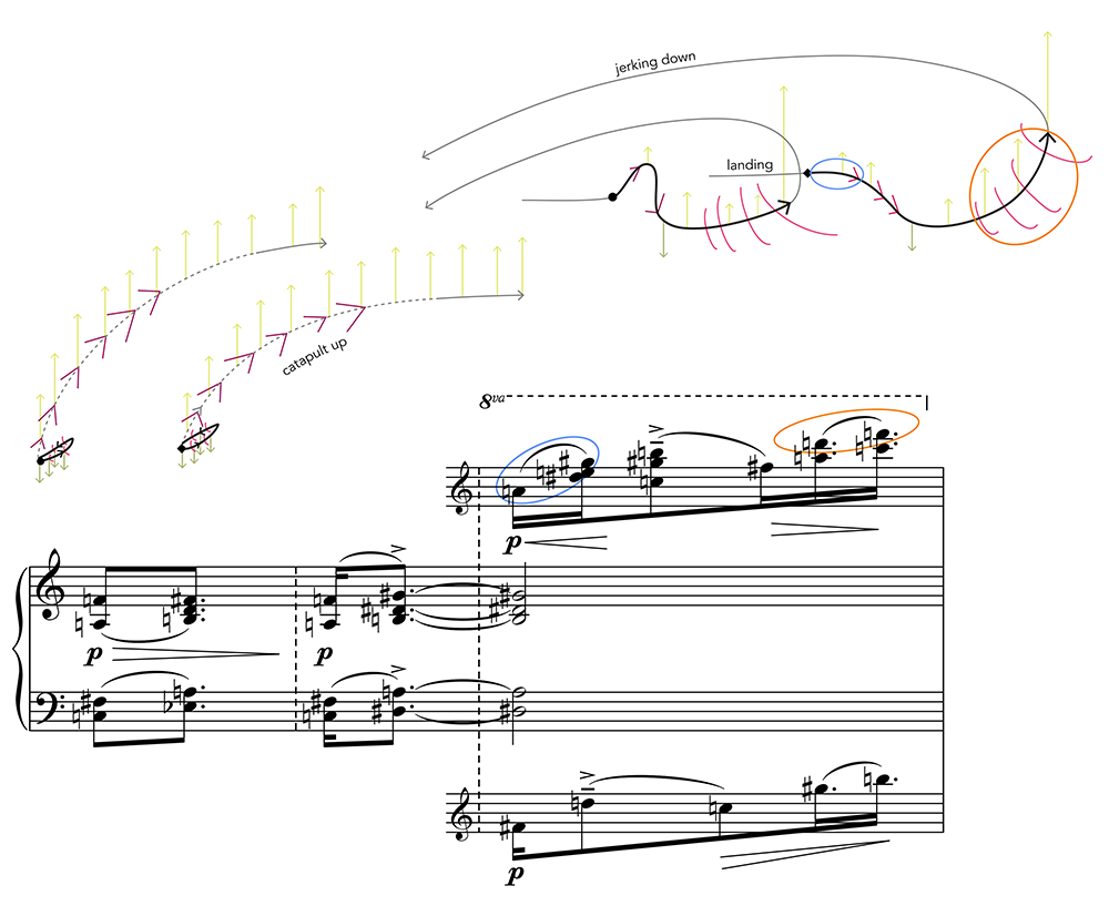 Example 16. Trace-form and score excerpt of mm. 45–7, 2’34”–2’40”Motif ii (D6-F6) circled in orange; motif iii (A4-G♯5) circled in blue