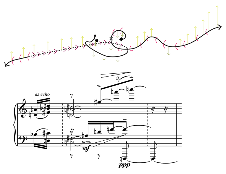 Trace-form and score excerpt of mm. 12–14, 0’41”–0’47”