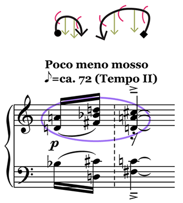 Example 7. Trace-form and score excerpt of mm. 9–10, 0’33”–0’35”Motif i and its transpositions circled in purple
