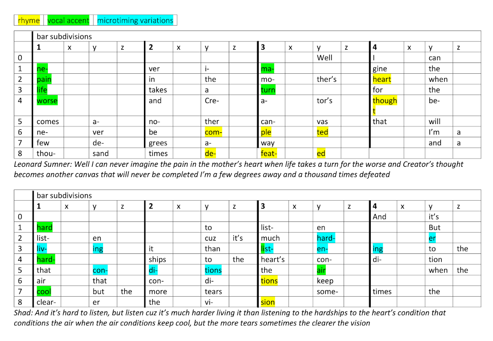 Example 6. Flow comparison, first stanzas of verse 1 (Leonard Sumner) and verse 2 (Shad) in “How I Feel.”