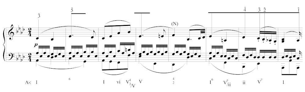 Example 10. Beethoven, Piano Sonata op. 13 (“Pathétique”), II, mm. 1–8, with melodic and harmonic analysis