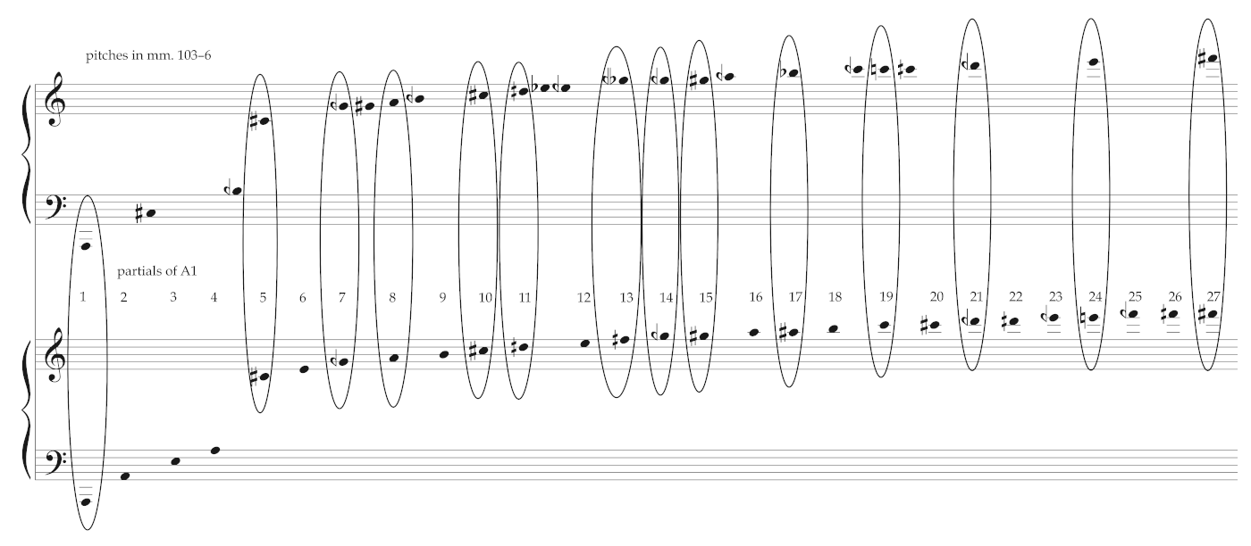 Example 12. Pitch content of Anderson, Eden, mm. 103–6, compared with quartertone-approximated partials of A1