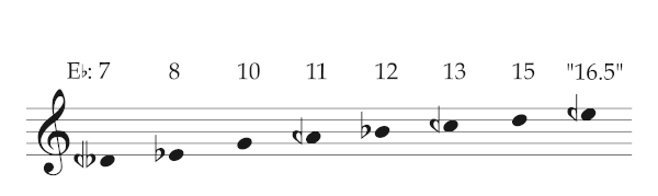 Example 16. Pitch content for the polyrhythmic unfurling of partials of E♭1 in Steiger, Post-truth Lament, mm. 1–35