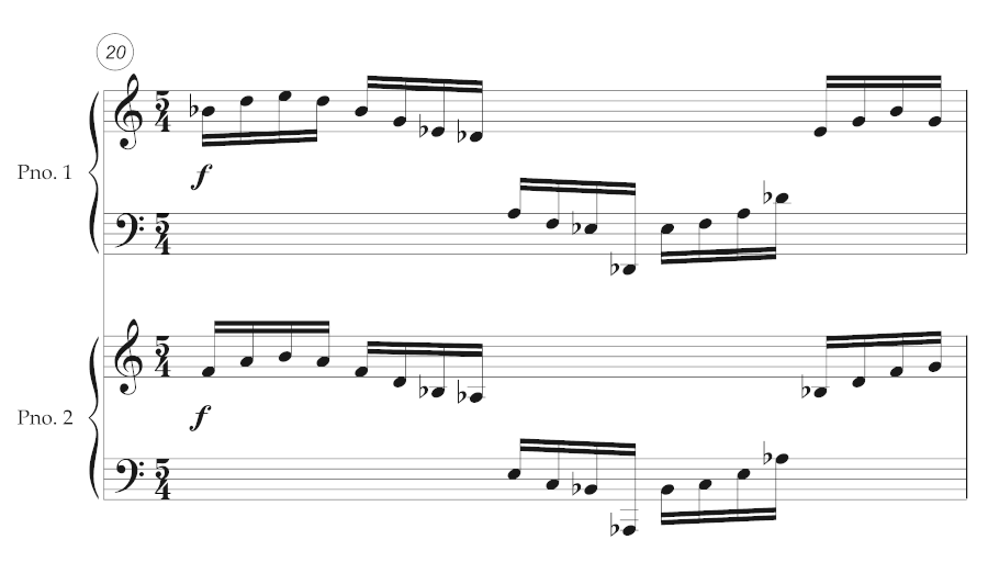 , m. 20. Piano 2 sounds one quartertone lower than written