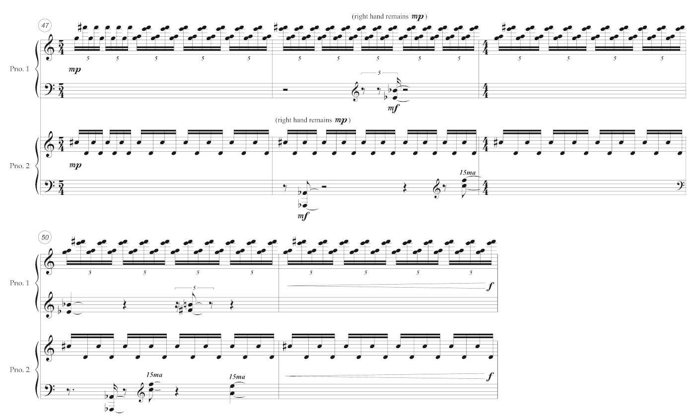 Example 20. Steiger, Post-truth Lament, mm. 47–51. Piano 2 sounds one quartertone lower than written