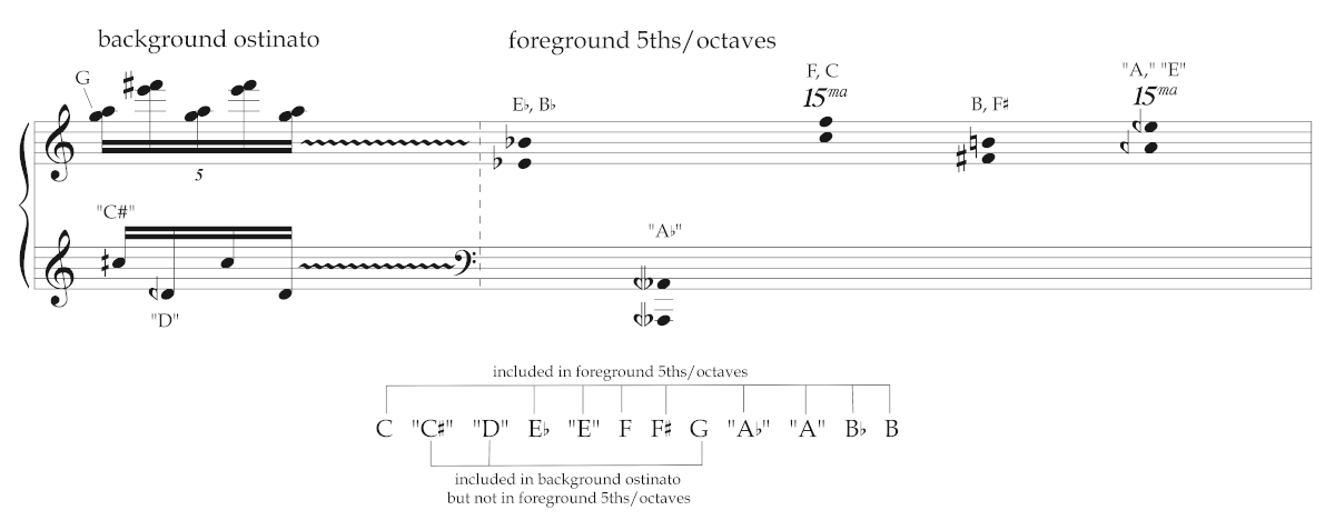 Example 21. Analysis of Steiger, Post-truth Lament, m. 50. 12-TET pitch classes realized on the second piano (and therefore lowered in tuning by a quartertone) are labeled in quotation marks