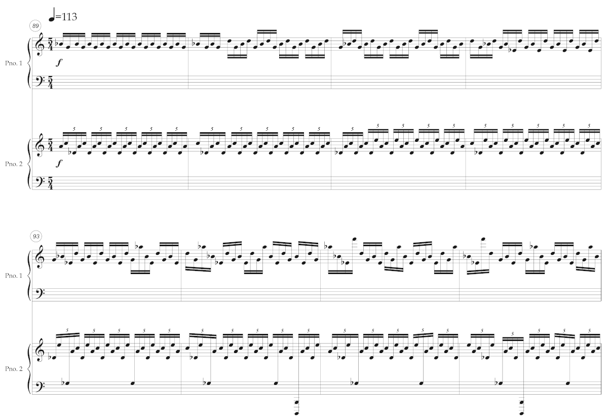 Example 24. Steiger, Post-truth Lament, mm. 89–96. Piano 2 sounds one quartertone lower than written