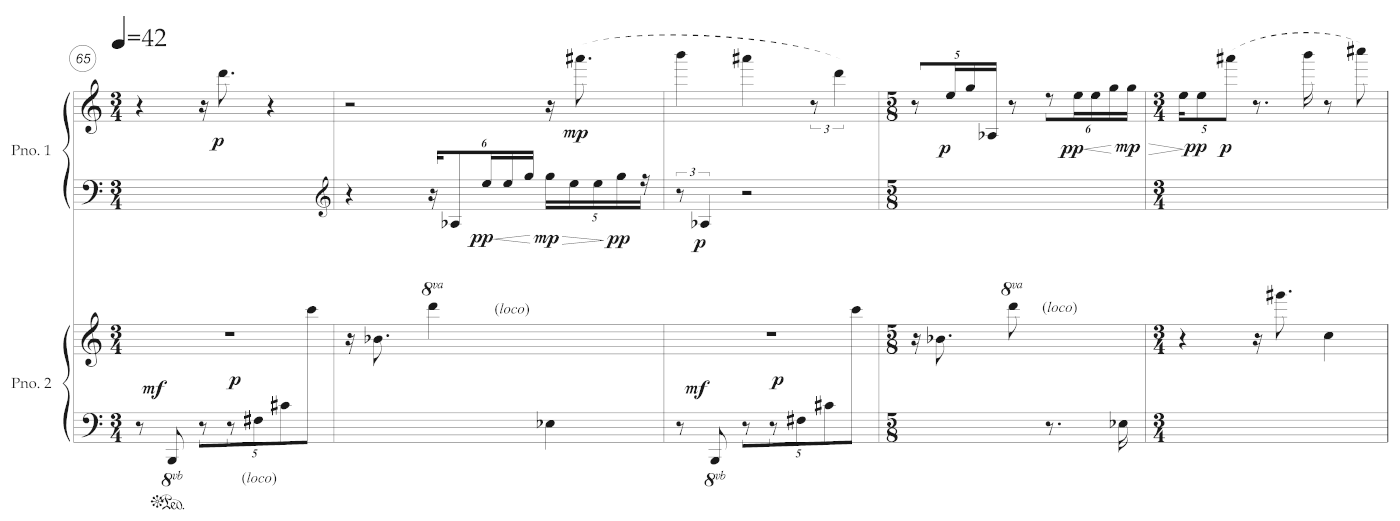 Example 26. Steiger, Post-truth Lament, mm. 65–69. Piano 2 sounds one quartertone lower than written
