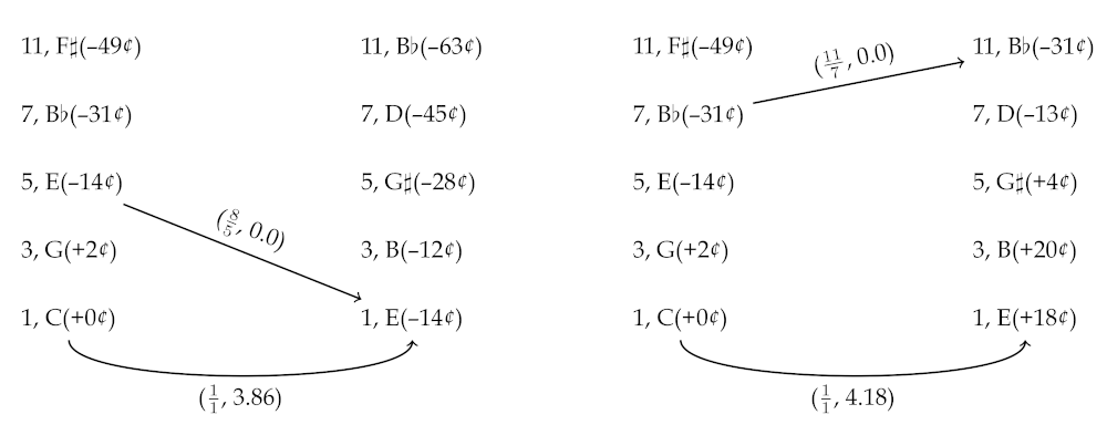 Two possibilities for realizing the modulation shown in Example 9 in just intonation