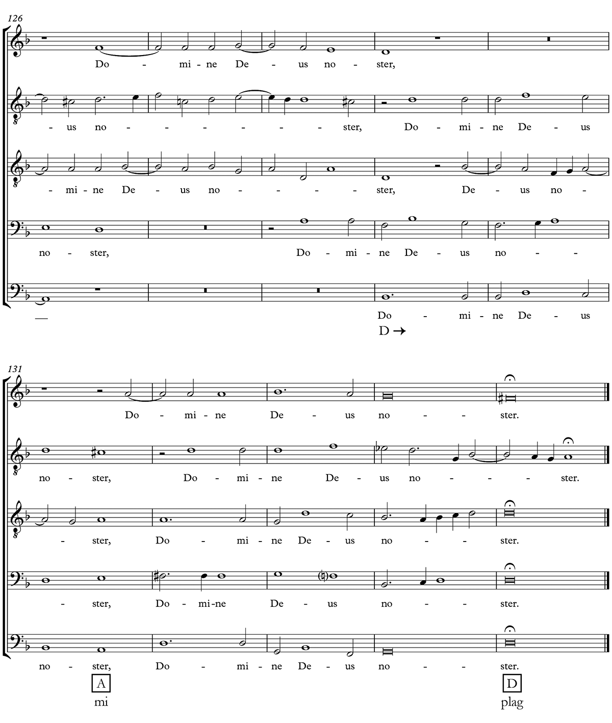 Example 13. Terminal plagal cadence in Byrd, “Sed veni Domine” (second part of “Vide Domine afflictionem”), mm. 126–135