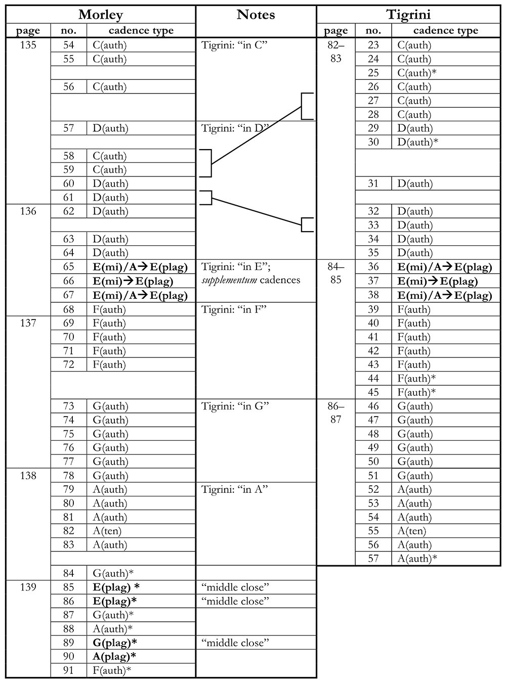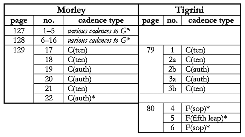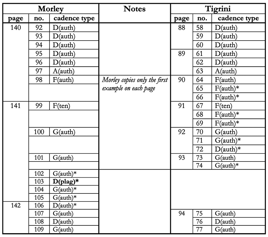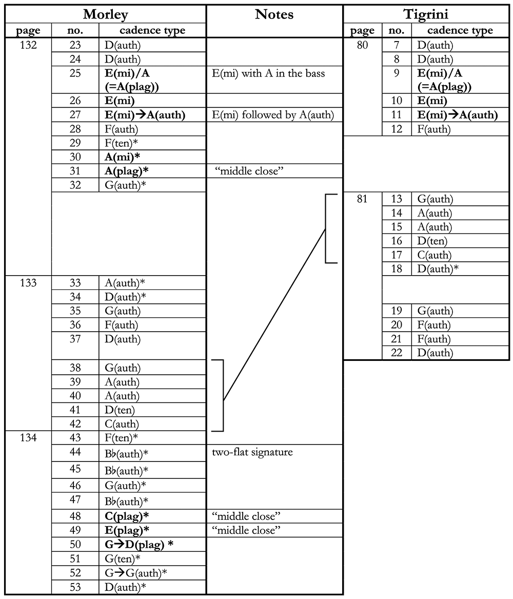 Appendix 1. Concordances between Morley and Tigrini (cf. Blackburn forthcoming). Asterisks denote a cadence without a concordance. Plagal and mi cadences are in boldface type. Cadence labels note the tonal focus of the cadence, followed by the type of cadence (auth = authentic cadence, ten = tenor cadence, sop = soprano cadence).