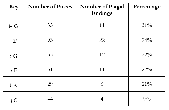 Proportion of Byrd’s published vocal works with terminal plagal cadences by key