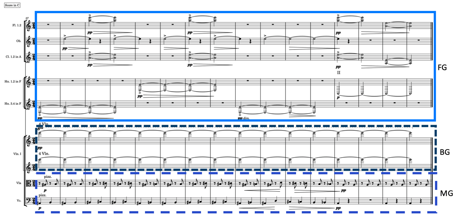 Example 21. Stratification (transforming) in three layers: Borodin, In the Steppes of Central Asia, mm. 27–42] Audio example 17 [recording by USSR Symphony Orchestra conducted by Evgeny Svetlanov, Melodiya/Angel