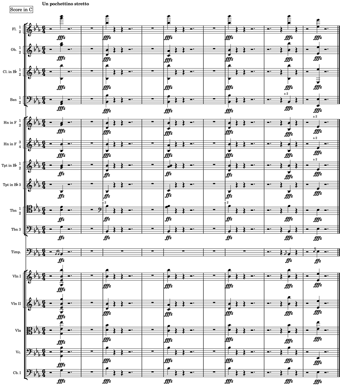 Example 6. Timbral augmentation (punctuated): Sibelius, Symphony no. 5, op. 82, iii, mm. 474–482 Audio example 3 [recording of Berliner Philharmoniker conducted by Herbert von Karajan, Deutsche Grammophon]