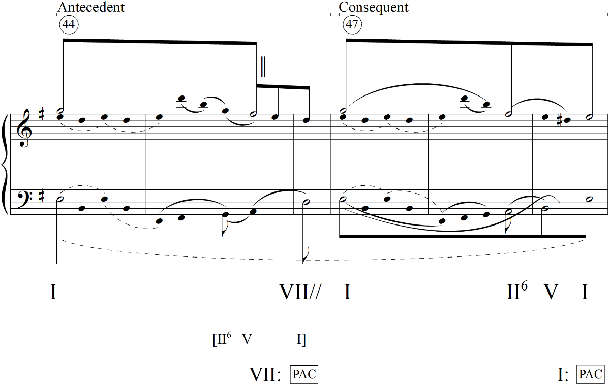 Example 12. Voice leading interpretation of Dvořák, Symphony No. 9 in E minor, Op. 95, fourth movement, mm. 44–9