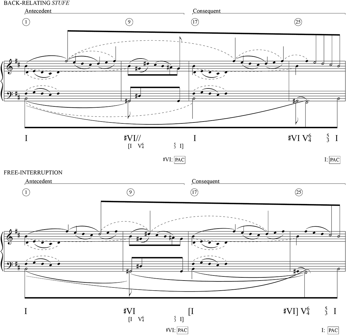 Example 15. Two voice-leading interpretations of Dvořák, String Quartet in G major, Op. 106, third movement, mm. 1–32, illustrating an interpretation with a back-relating Stufe and a free interruption