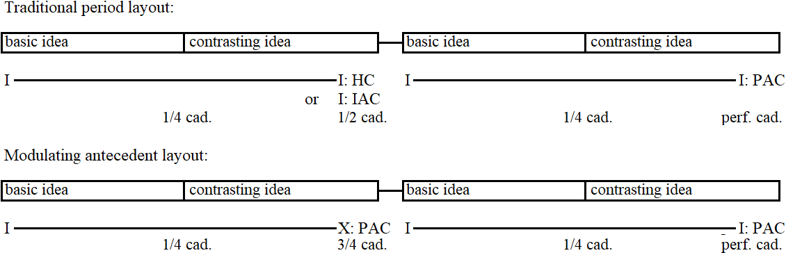 Example 19. A traditional period and a period with modulating antecedent, displayed using Reicha’s cadential terminology.