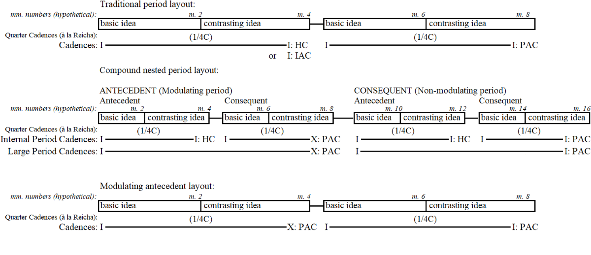 Example 20. Formal layout of the standard antecedent-consequent period, the compound nested period, and a period with modulating antecedent