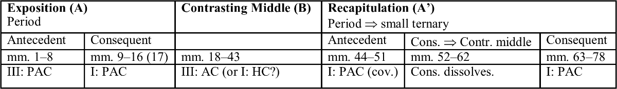 Example 24. Dvořák, Piano Trio in B-flat major, Op. 21, third movement, mm. 1–78, formal outline