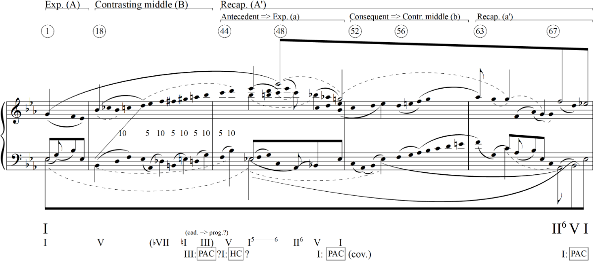 Example 26. Voice leading interpretation of Dvořák, Piano Trio in B-flat major, Op. 21, third movement, mm. 36–51