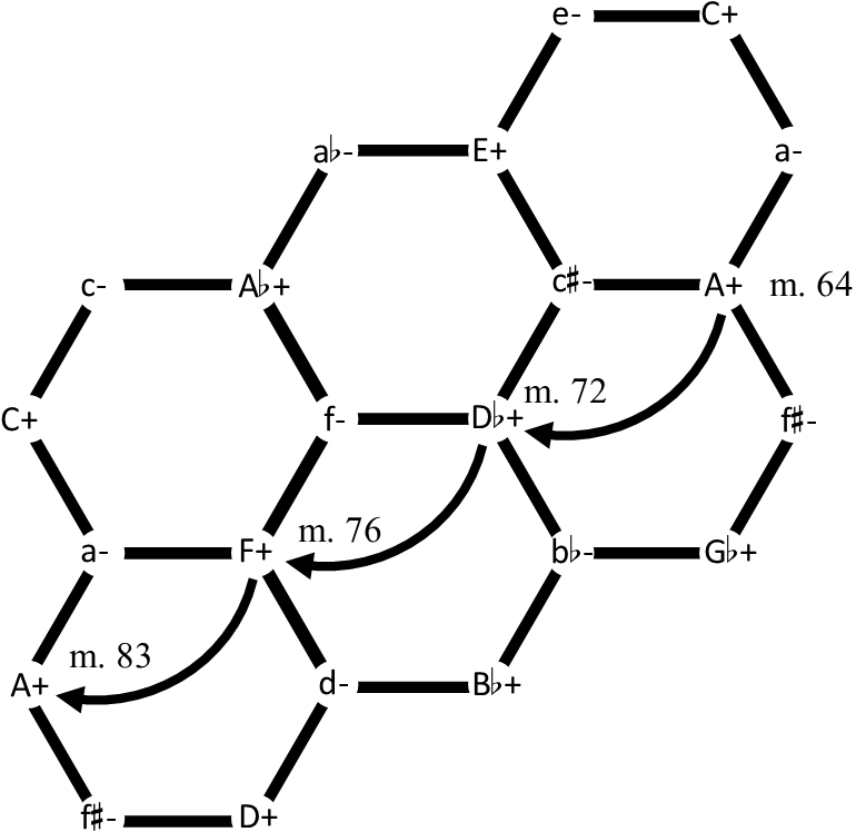 Example 29. Dvořák, Polonaise for Cello and Piano in A major, B. 94, mm. 64–82, a neo-Riemannian interpretation