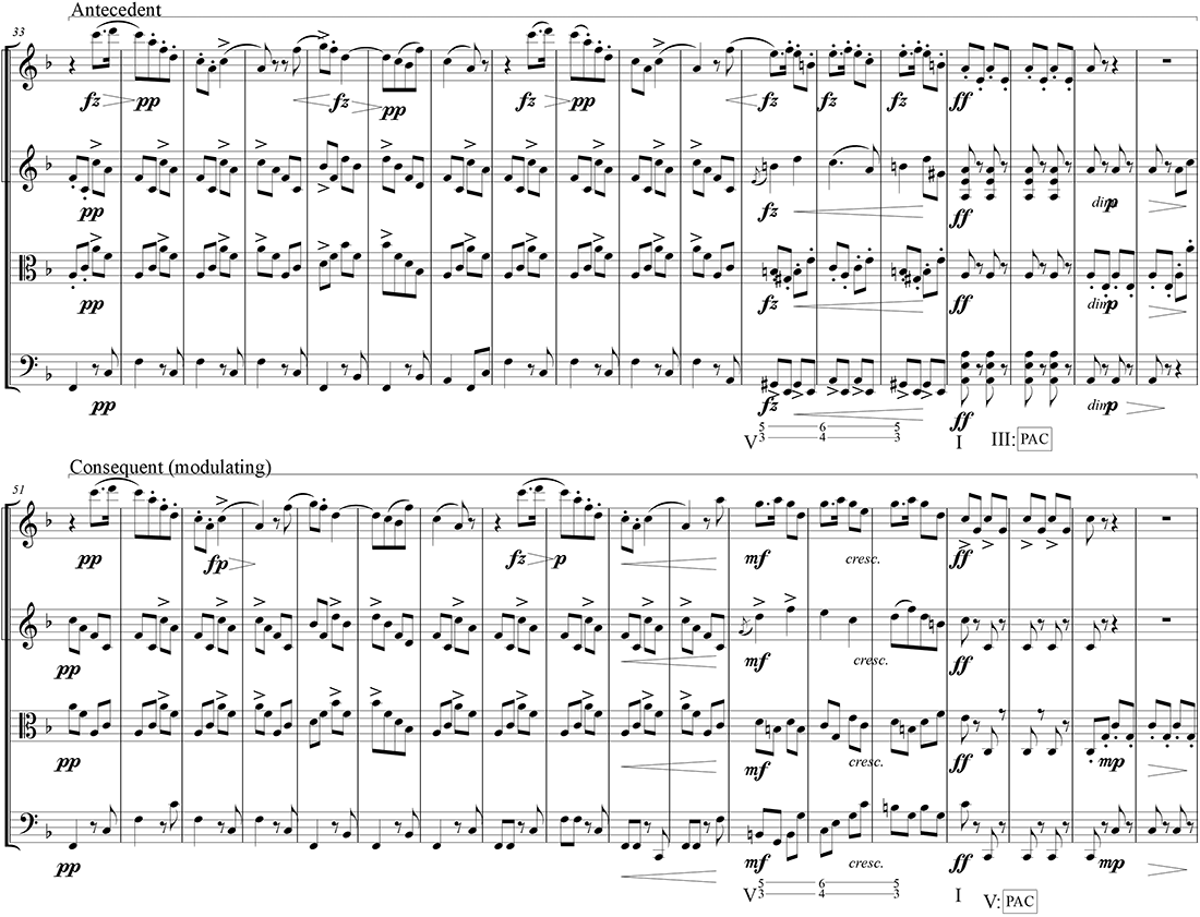 Example 31. Dvořák, String Quartet No. 12 in F major “American,” Op. 96, first movement, mm. 33–67