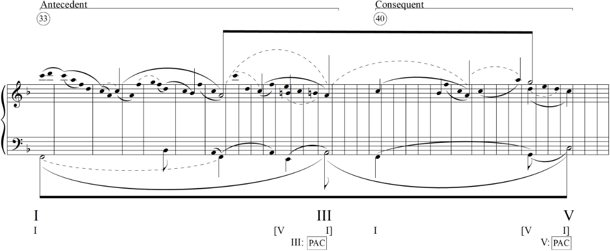 Example 32. Voice-leading interpretation of Dvořák, String Quartet No. 12 in F major “American,” Op. 96, first movement, mm. 33–67