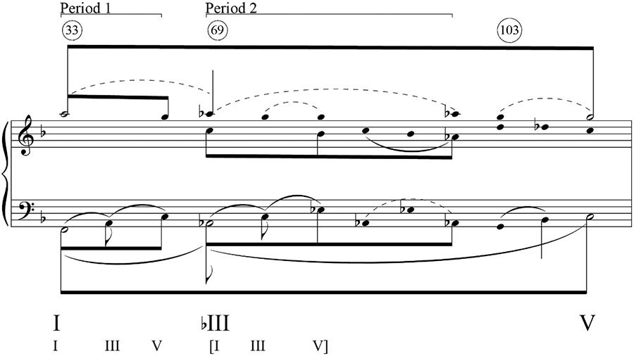 Example 35. Middleground voice-leading interpretation of Dvořák, String Quartet No. 12 in F major “American,” Op. 96, first movement, mm. 33–122