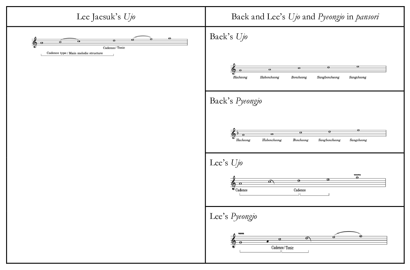 Example 3-10. Comparing Lee Jaesuk’s analysis of jinyangjo-Ujo in gayageum sanjo with Baek’s and Lee’s modal theories in pansori