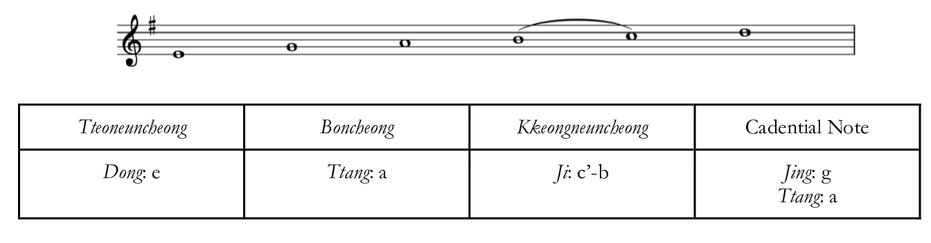Example 3-18. Kim Haesuk’s modal analysis of the jinyangjo movement of Ujo in oral tradition of Choe-Oksan ryu gayageum sanjo (rhythmic cycles 1–3 and 11–19)