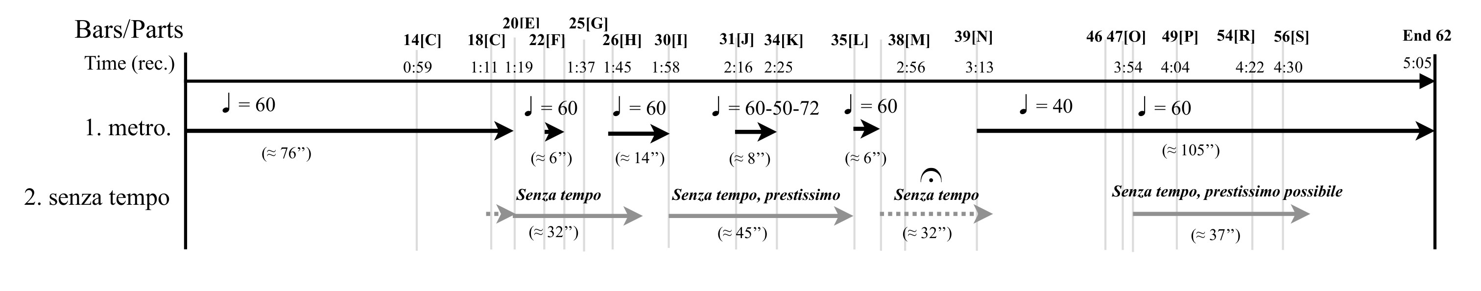 Example 1. Metronomic and senza tempo strata of the first movement. Black arrows represent the metronomic stratum. Full gray arrows represent passages composed of grace notes, and dotted gray arrows represent passages of held sounds or silences. Time indications correspond to Pierre Boulez’s 1983 recording of the Kammerkonzert with Ensemble Intercontemporain.