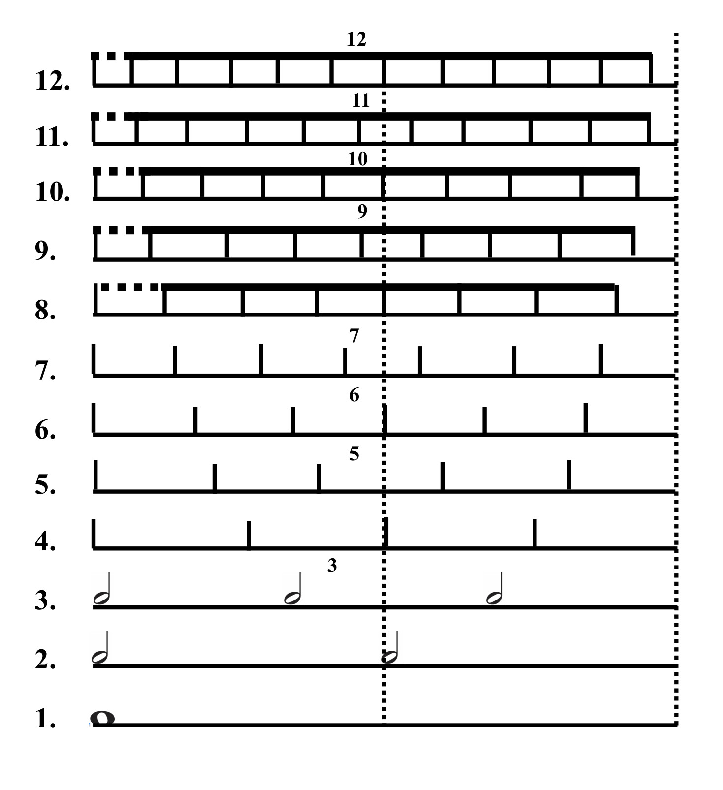 Example 5. Superimposition of harmonic divisions, called a spectrum of “duration-formants.” A whole note is taken as the fundamental duration. Figure adapted from Example 5 in Stockhausen’s “. . . how time passes . . . .” (1957, 17)